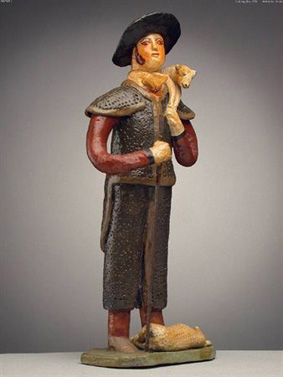 - Pastor ofertante em pé, com tarro e ovelha ao colo.