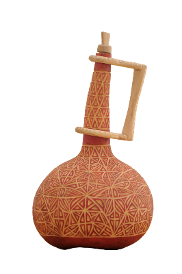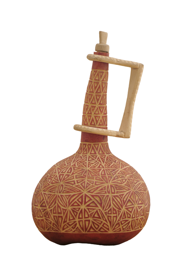 Recipiente para líquidos. Cabaça e madeira. Dimensões (cm): altura com tampa: 29; diâmetro do bojo: 16. Trabalho feito à navalha, com a superfície da peça pintada a anilina e coberta de rebaixos escavados, desenhando motivos geométricos. No fundo, a marca MSG (Miguel Serol Gomes). Último quartel do séc. XX.
