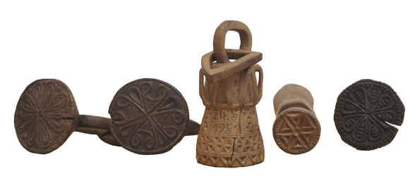 Marcadores em madeira, usados para marcar o pão ou decorar bolos, confeccionados muitas vezes em fornos colectivos. Independentemente da sua complexidade, cada um deles foi executado a partir de um único pedaço de madeira. Da direita para a esquerda: