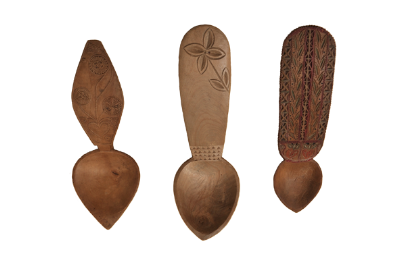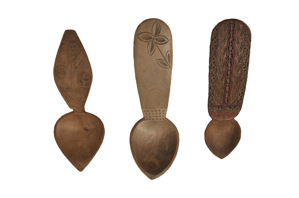 Em madeira, de pequenas dimensões, por vezes transportadas por pastores e ganhões na fita do chapéu. Normalmente aquelas que tinham uma decoração mais requintada, eram destinadas a oferecer à conversada, à prometida, ao patrão ou à patroa. Da esquerda para a direita: