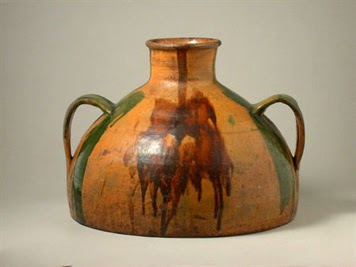 CÂNTARO - Vaso grande, bojudo, com gargalo e asa, para transporte de líquidos. Em barro ou metal. CÂNTARO DE BARRO DE ESTREMOZ (altura: 40 cm; diâmetro máximo: 68 cm) com cerca de 5 litros de capacidade. Fabrico da Olaria Alfacinha (Anos 40 do séc. X). Decoração com folhas, bolotas e ramos de sobreiro moldados em barro e colados à superfície, conjugados com algum polimento daquela. A própria asa é uma pernada de sobreiro. No lado oposto, o brasão de armas de Estremoz. Colecção do autor. - Vaso grande, bojudo, com gargalo e asa, para transporte de líquidos. Em barro ou metal. CÂNTARO DE BARRO DE ESTREMOZ (altura: 40 cm; diâmetro máximo: 68 cm) com cerca de 5 litros de capacidade. Fabrico da Olaria Alfacinha (Anos 40 do séc. X). Decoração com folhas, bolotas e ramos de sobreiro moldados em barro e colados à superfície, conjugados com algum polimento daquela. A própria asa é uma pernada de sobreiro. No lado oposto, o brasão de armas de Estremoz. Colecção do autor.