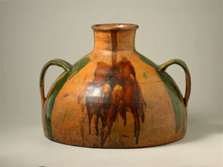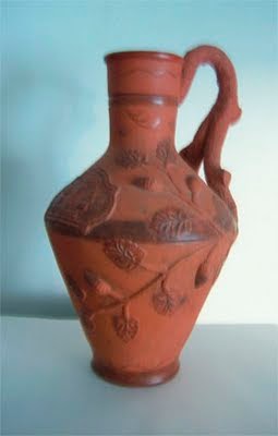 CÂNTARO - Vaso grande, bojudo, com gargalo e asa, para transporte de líquidos. Em barro ou metal. CÂNTARO DE BARRO DE ESTREMOZ (altura: 40 cm; diâmetro máximo: 68 cm) com cerca de 5 litros de capacidade. Fabrico da Olaria Alfacinha (Anos 40 do séc. X). Decoração com folhas, bolotas e ramos de sobreiro moldados em barro e colados à superfície, conjugados com algum polimento daquela. A própria asa é uma pernada de sobreiro. No lado oposto, o brasão de armas de Estremoz. Colecção do autor. - Vaso grande, bojudo, com gargalo e asa, para transporte de líquidos. Em barro ou metal. CÂNTARO DE BARRO DE ESTREMOZ (altura: 40 cm; diâmetro máximo: 68 cm) com cerca de 5 litros de capacidade. Fabrico da Olaria Alfacinha (Anos 40 do séc. X). Decoração com folhas, bolotas e ramos de sobreiro moldados em barro e colados à superfície, conjugados com algum polimento daquela. A própria asa é uma pernada de sobreiro. No lado oposto, o brasão de armas de Estremoz. Colecção do autor.