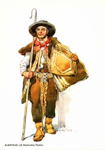 SAMARRA – Peça de vestuário confeccionada com pele de ovelha, sem mangas e com uma aba até ao joelho. ALENTEJO – PASTOR. Bilhete-postal ilustrado nº 32 da "Série B" - Costumes Portugueses, tendo impresso no verso um selo do tipo "TUDO PELA NAÇÃO" de $25 (azul) ou de 1$00 (vermelho). A ilustração é de ALBERTO DE SOUZA (1880-1961), notável aguarelista e ilustrador, que calcorreou o país de lés a lés na primeira metade do século XX, funcionando como consciência plástica da Nação.
