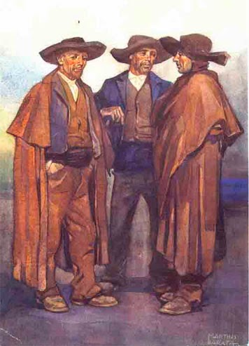 CAPOTE - Capa comprida e larga, com cabeção e capuz, confeccionada em burel. COSTUMES ALENTEJANOS (1923) – Aguarela sobre cartão (37 cm x 26, 5 cm). Jaime Martins Barata (1899-1970). Museu Grão Vasco, Viseu.