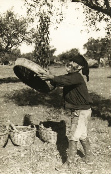 CABANEJOS - Cestos de vime de duas asas, de forma tronco-cónica, medindo aproximadamente 30 cm de altura por 20 cm a 25 cm de largura, utilizado na recolha da azeitona pelas mulheres envolvidas na sua apanha. LIMPANDO AZEITONA. Bilhete-postal ilustrado, edição de Gama Freixo.