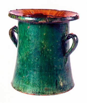 TENOR - Vasilha de barro vidrado, de base circular e plana, de corpo habitualmente semi-esférico e com duas asas, destinado a aparar a aguardente que escorre do alambique, no termo da destilação do vinho. Fabrico do Redondo, séc. XX. Dimensões (cm) - altura: 33; largura: 40; diâmetro: 43. Museu Nacional de Etnologia, Lisboa.
