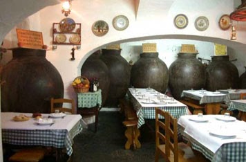 TALHA - Vasilha de boca estreita e de grande bojo, destinada a armazenar azeite, vinho, óleo, cereais, carne, etc., e cujo uso remonta a fenícios e romanos. Havia talhas de barro para a fermentação de mostos e posterior armazenagem de vinho, de todos os tamanhos e feitios, que podiam chegar a conter 2.000 litros de mosto, com pesos rondando a tonelada e uma altura de quase dois metros. O facto de o barro ser poroso obrigava à impermeabilização da talha com pez, recorrendo a processos ancestrais, transmitidos de geração em geração, os quais conferiam particularidades distintas a cada talha de barro e consequentemente ao vinho nela contido. TALHAS PARA VINHO – Adega do Isaías, em Estremoz.